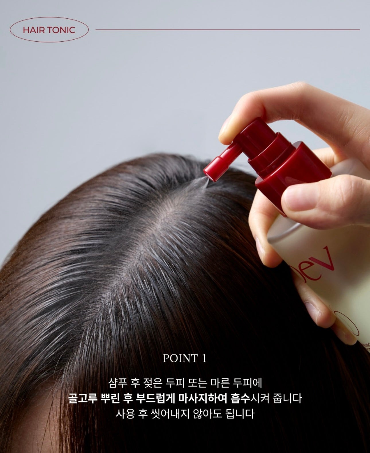 3)噴灑後,利用指腹不要用指甲以畫圓方式輕輕按摩整個頭皮約 2-3 分鐘